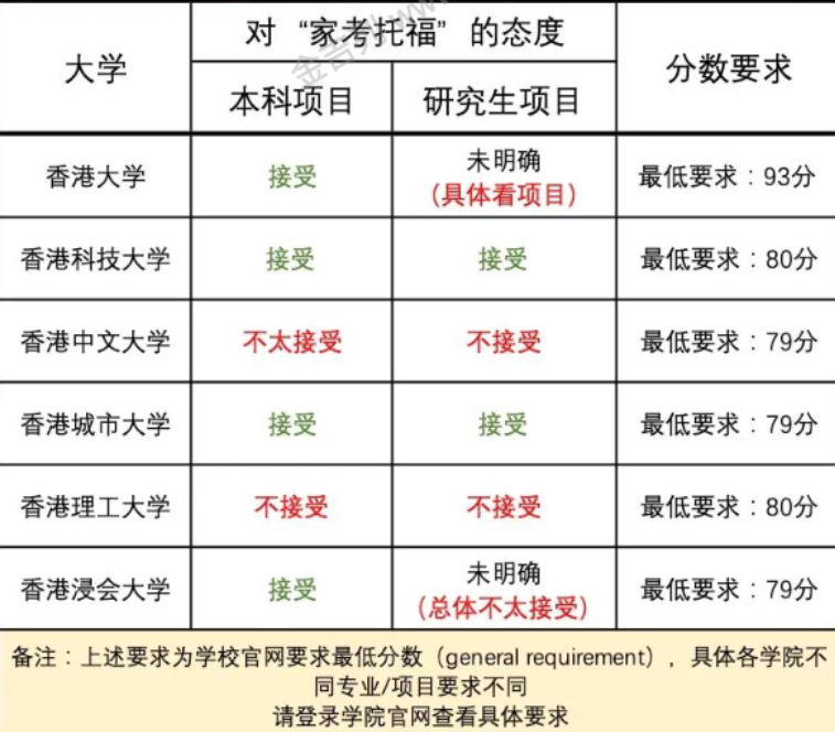 总体来讲,香港高校对家考托福成绩的态度大致有以下几类: