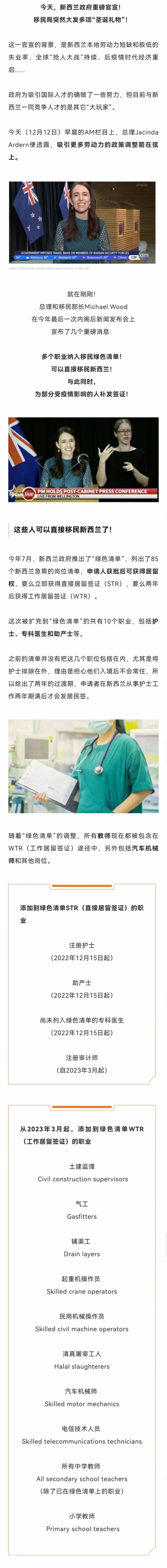 12月12日新西兰总理Jacinda Ardern和移民部长Michael Wood在今年最后一次内阁后新闻发布会上宣布了几个重磅消息:多个职业纳入移民绿色清单!