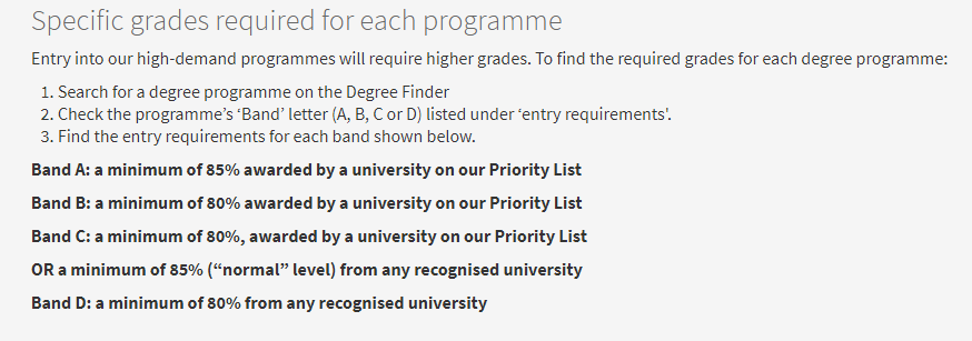 Band C要求均分80%以上,以及其他学信网认可大学,均分85%以上