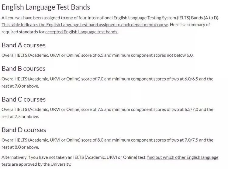华威大学按照ABCD的分组,对于申请者的语言成绩提出了要求。雅思总分成绩至少需要6.5分,单项不能低于6.0分。