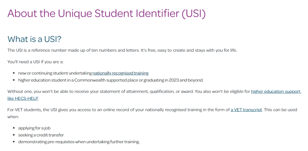 USI 的全称 是Unique Student Identifier(学生唯一身份识别码 )由澳洲政府 发布的学生参考代码。 这个代码可以证明学生 在澳洲 接受过 系统教育或培训。 它是 每一个在 澳大利亚 上学的留学生 唯一 的识别代码。 也就是说 每个人的USI码是终身且唯一的。