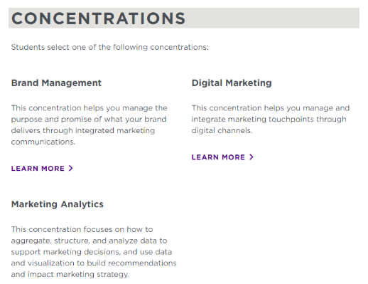 核心课程:整合营销、Campaign I:战略与执行、竞争战略、Campaign II:规划与管理、数据库管理与建模、营销决策财务、数字营销、统计测量、分析与研究等。