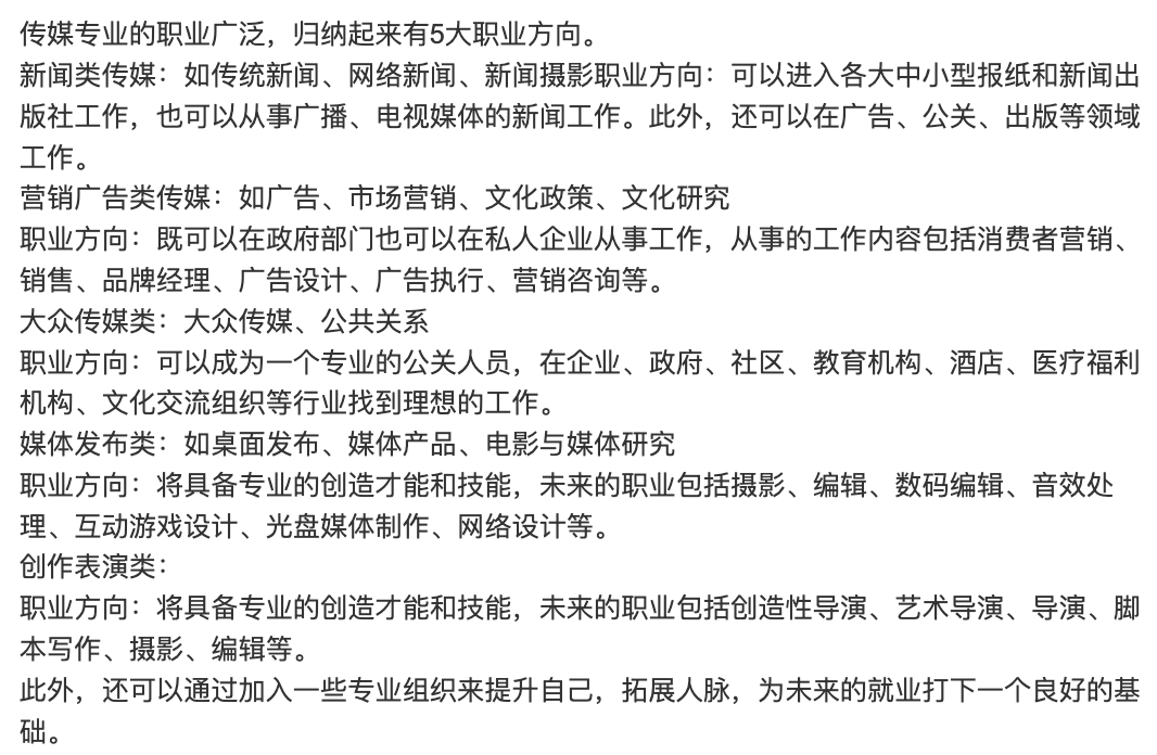 传媒的就业前景广阔,涵盖行业包括出版、印刷、教育、政府、酒店、广告、公关、娱乐(电影、电视、电台、音乐)、新闻、艺术、服装以及大型企业的市场推广部门等,涵盖的职能包括:市场咨询、活动与广告策划、平面设计与制作、公关宣传、企业形象包装、品牌推广、营销等等。
