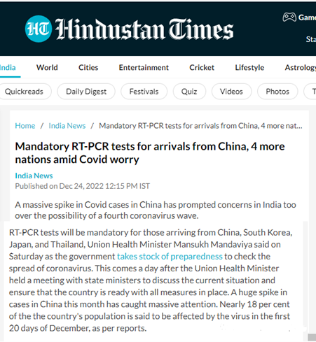 印度卫生和家庭福利部宣布,来自中国内地、中国香港、日本、泰国和韩国的国际旅客前往印度时必须携带 RT-PCR 检测报告,在抵达印度时被发现有症状或 COVID-19 检测呈阳性的人将被隔离。
