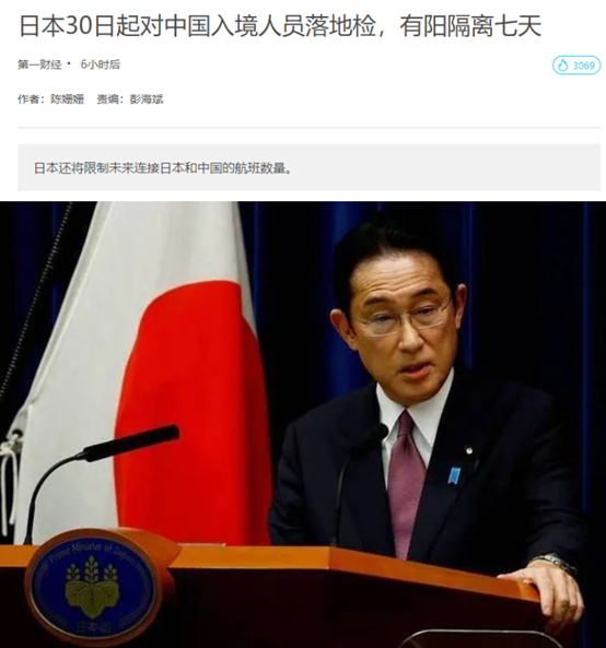 日本首相岸田文雄宣布自 12 月 30 日起, 7 天内有中国旅居史的旅客在入境日本时需接受落地检,若检测结果呈阳性,将被要求进行 7 天隔离。此外还将对往返中国的航班数量进行一定限制。