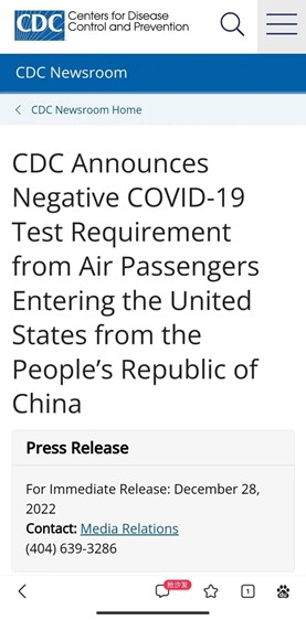 根据美国疾病控制与预防中心发布的通告,来自中国的乘客入境美国需要提供新冠检测报告,开始时间是 2023 年 1 月 5 日 12:01am 。