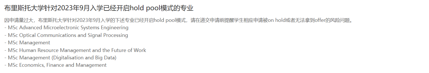 因申请量过大,布里斯托大学针对2023年9月入学的下述专业已经开启hold pool模式,请在递交申请前提醒学生相应申请被on hold或者无法拿到offer的风险问题。