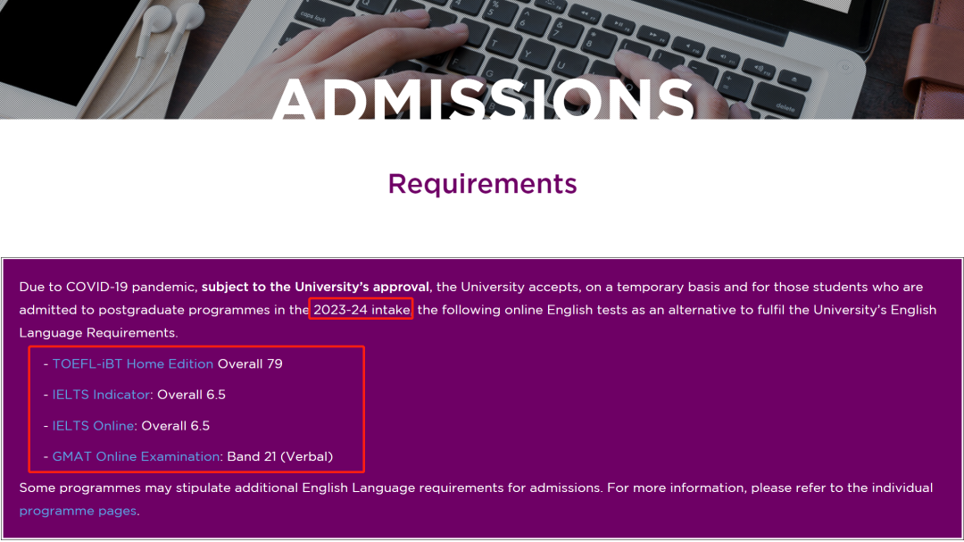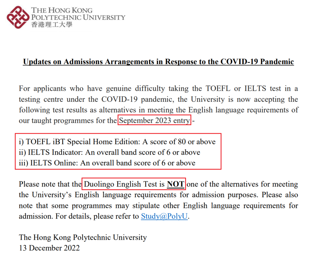 香港理工大学 近日,对于因新冠肺炎疫情而难以参加托福或雅思考试的申请人,香港理工大学将接受以下考试成绩作为2023年9月入学满足英语语言要求的替代方案: 语言要求: 托福家庭版80 雅思家庭版6 雅思在线版6
