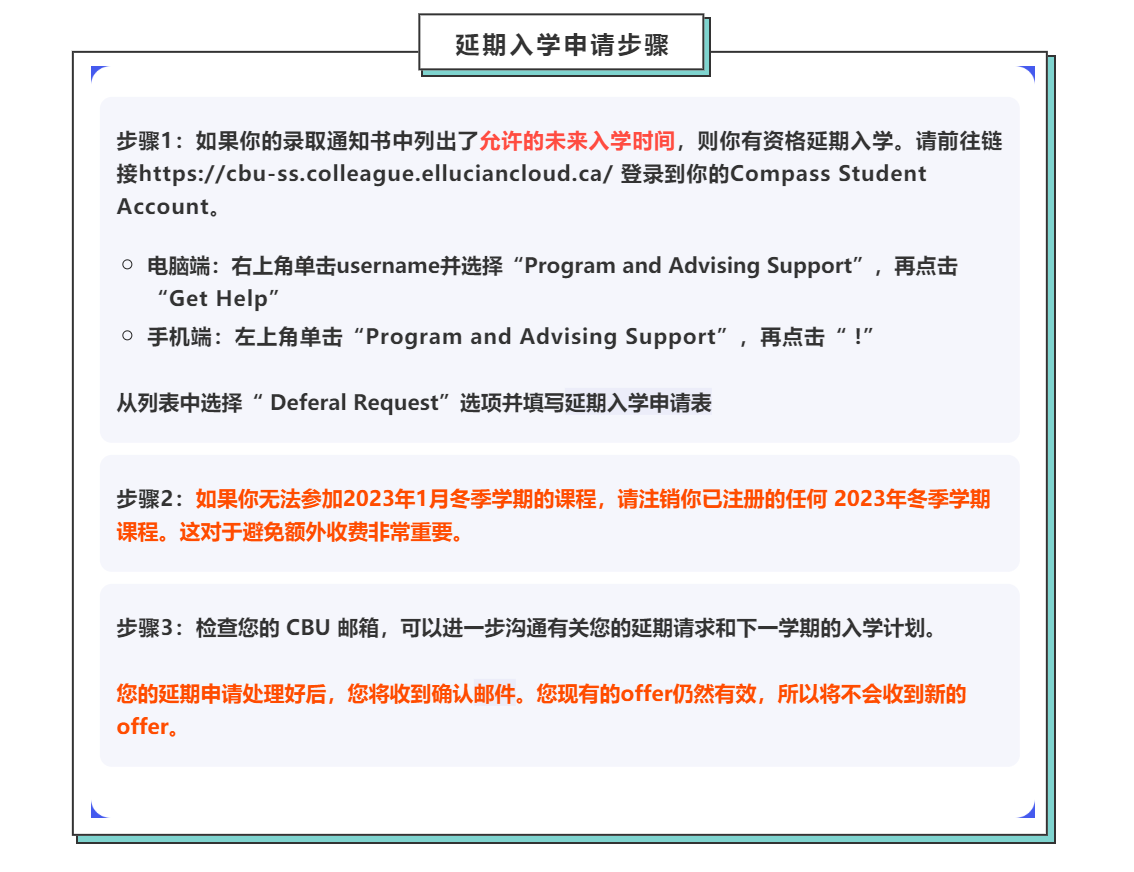 如果你尚未收到允许你能赶在2023 年 1 月前入境加拿大的签证, 并需要推迟入学时间,请仔细阅读以下页面。自12 月 23 日起,卡普顿大学校园将进行圣诞及新年假期的关闭,并于2023年1 月3 日重新开放。尽管在此期间不会处理任何延期入学请求,但你仍可以在此期间按照以下步骤提交延期入学请求。