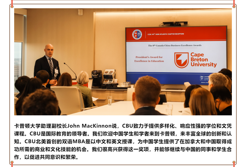 卡普顿大学在11月29日举行的加中贸易理事会(CCBC) 2022年 年会上获得了CCBC颁发的杰出教育金奖,这是加拿大教育领域的唯一金奖。11月30日 卡普顿大学助理副校长John MacKinnon在加中贸易理事会年会Halifax分会场领取该金奖奖杯 ,以彰显国际学生在加拿大和加中关系中发挥的重要作用。