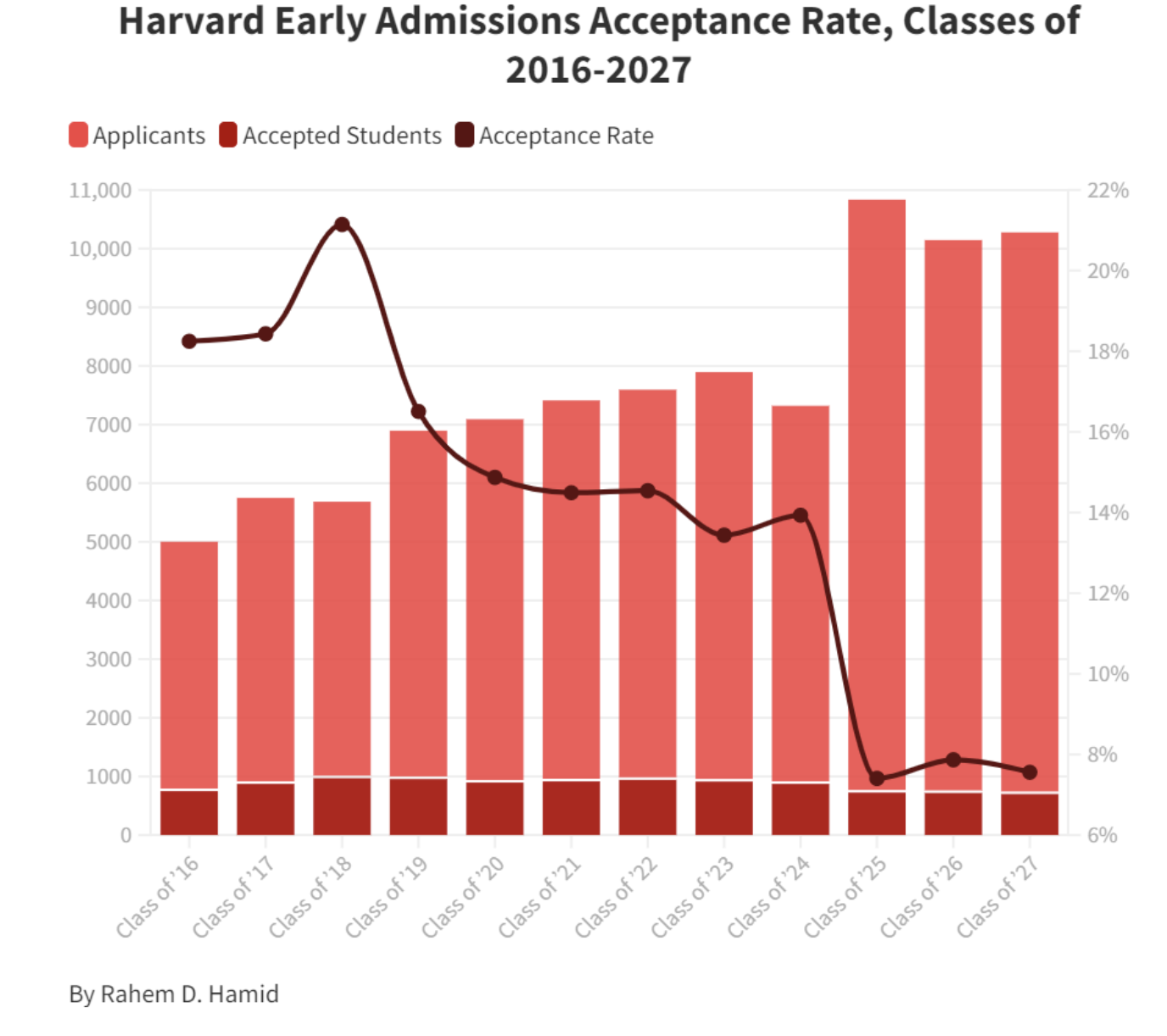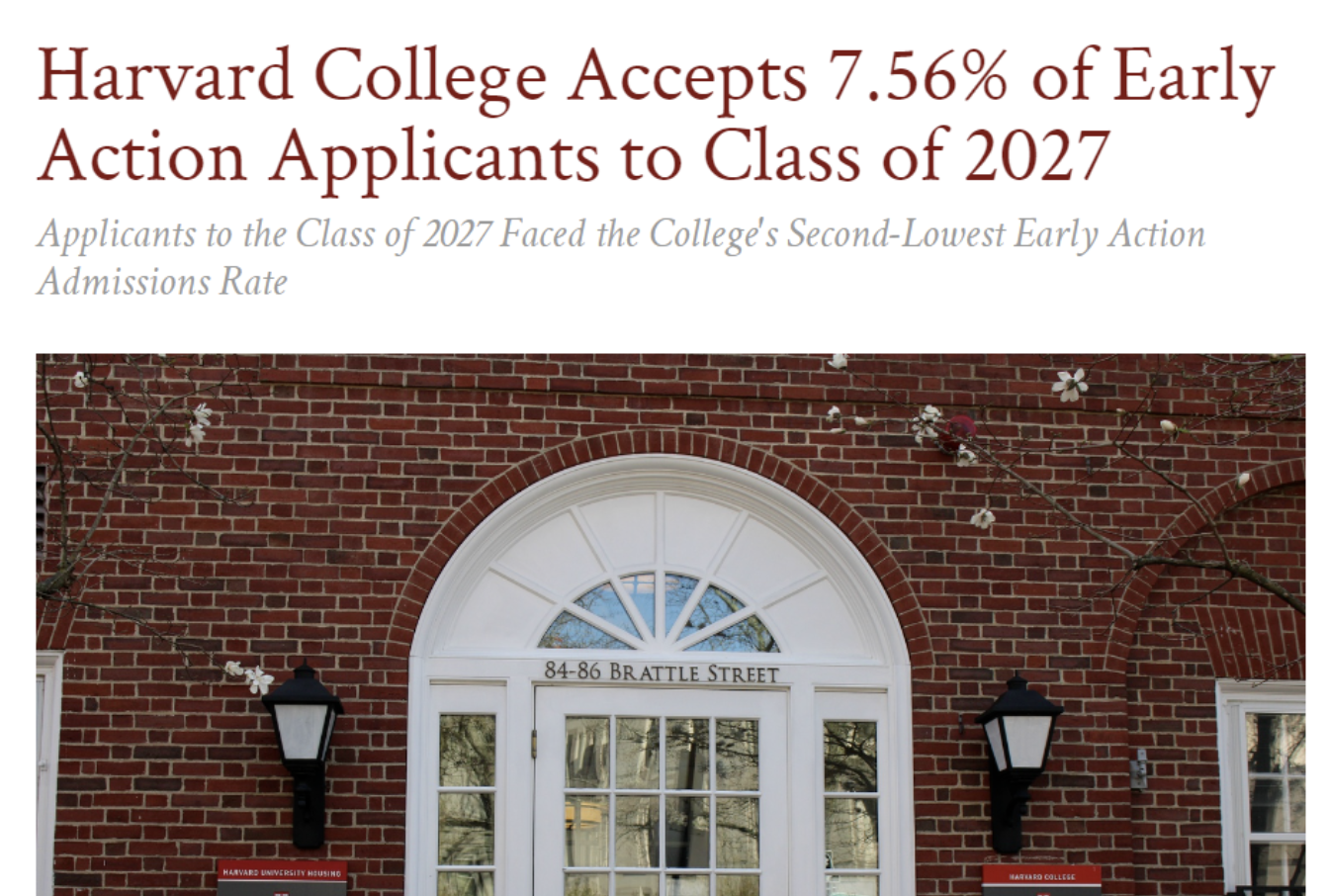 哈佛大学在早申请阶段共收到了9,553份申请,最终录取了722名学生,早申录取率为7.56%。约78%的早申请Deferred被延期到常规轮申请再考虑;9.5%的申请生被直接拒绝。