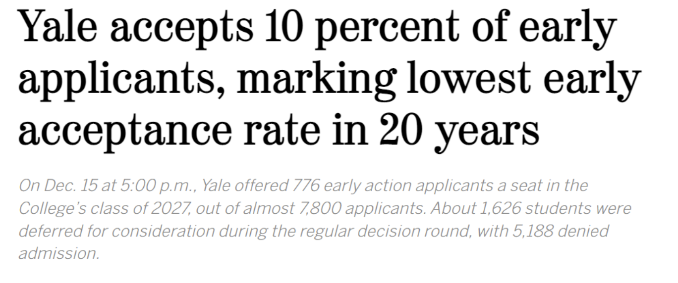 耶鲁大学在早申请阶段收到了7,744名学生申请,共有776人被录取,早申录取率为10%,是20年来最低的一次。