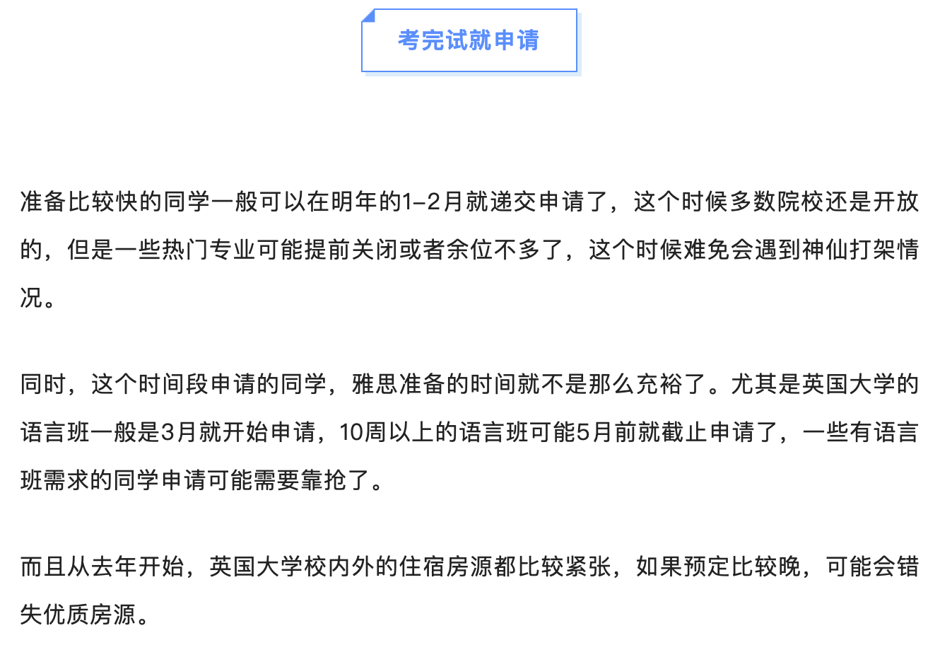 还有一点给大家强调下:考研后申请英国留学之所以还来的及,一是学校录取满位后才截止,一般都会持续长时间接受申请;二是英国申请不用带合格雅思,这样就给大家足够的时间准备雅思。