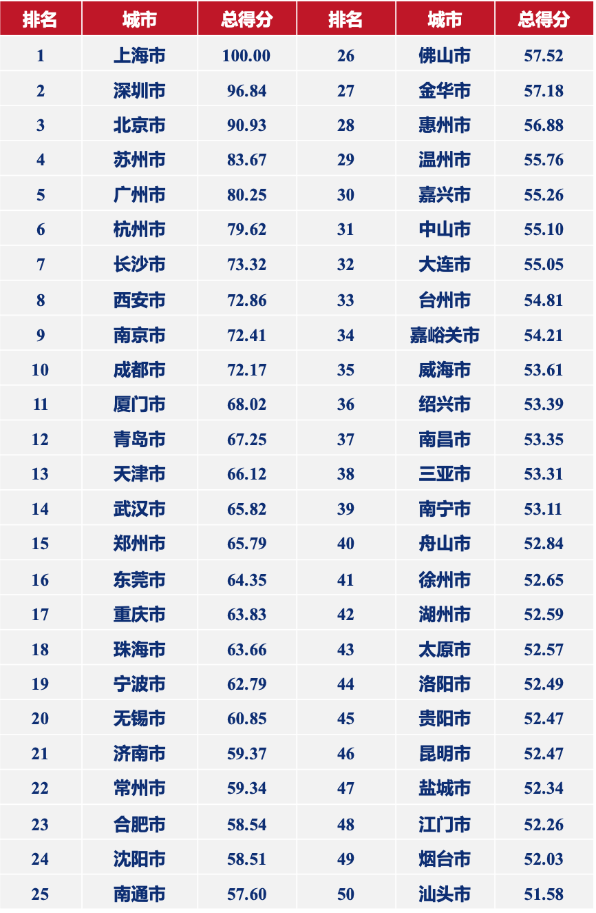 最吸引人才Top-50城市榜单