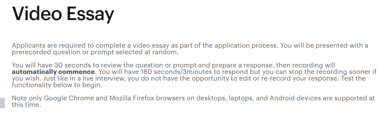 卡内基梅陇大学硕士申请,很多专业需要在网申系统中录制一个video essay视频。系统随机出题目,30秒看题,就开始录制视频。如下范例: