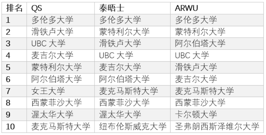 在QS、泰晤士、上海软科三大排名“计算机科学”(computer science)科目中,位列加拿大前十的大学如下: