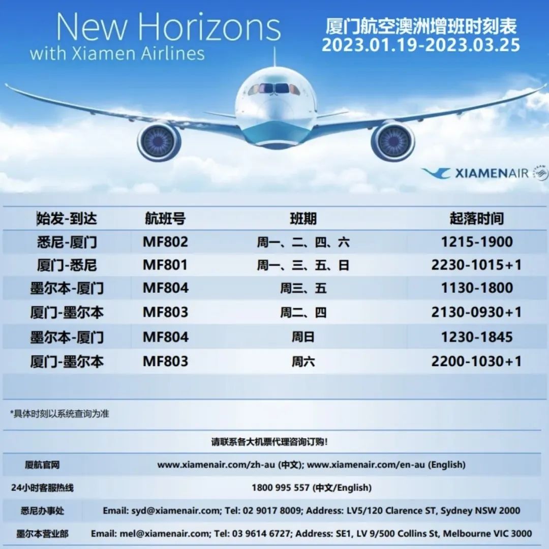 - 厦门-墨尔本,每周三班,分别是周二、四、六