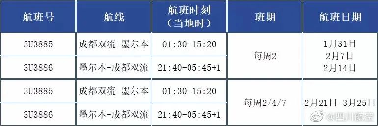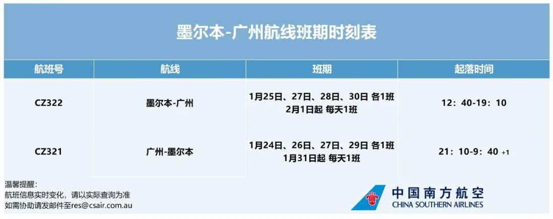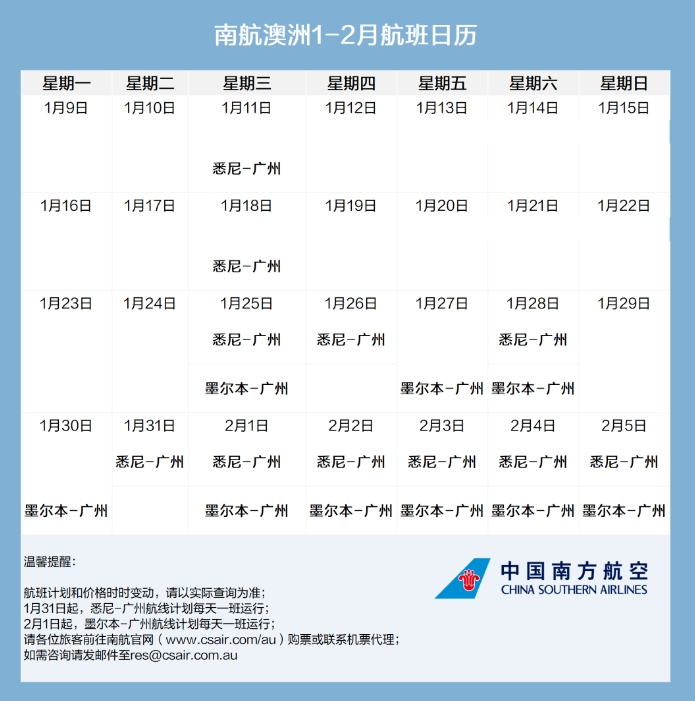 广州-墨尔本,1月24日、26日、27日、29日各一班;1月31日起,每天一班。