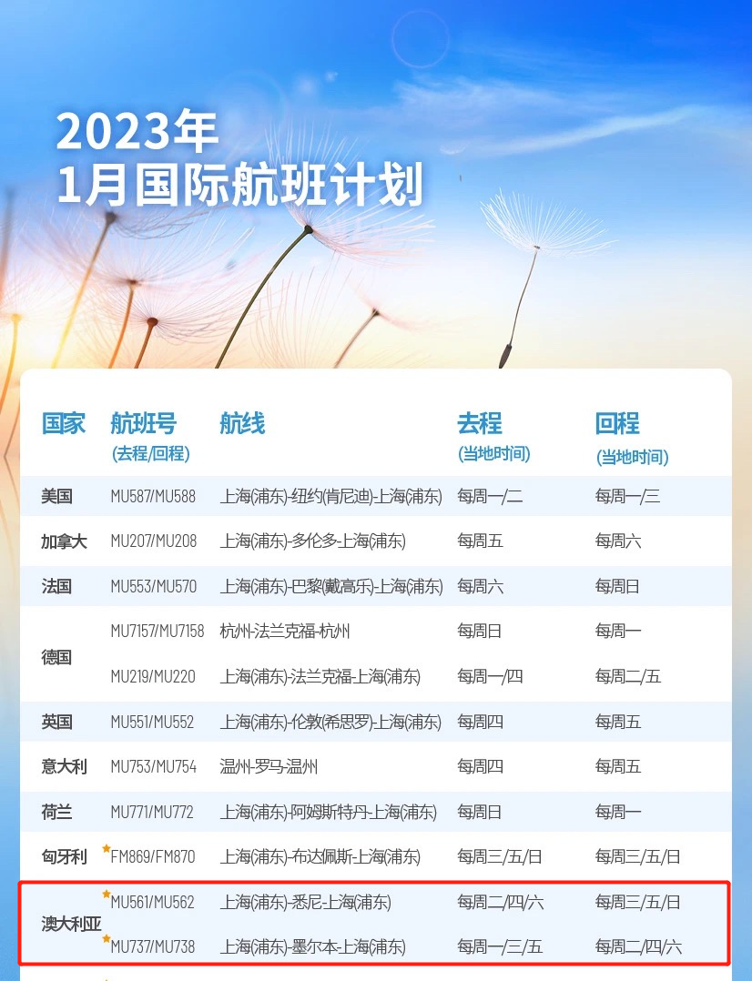 1月23日起新增上海(浦东)-墨尔本航线, 每周三班, 分别是周一、三、五