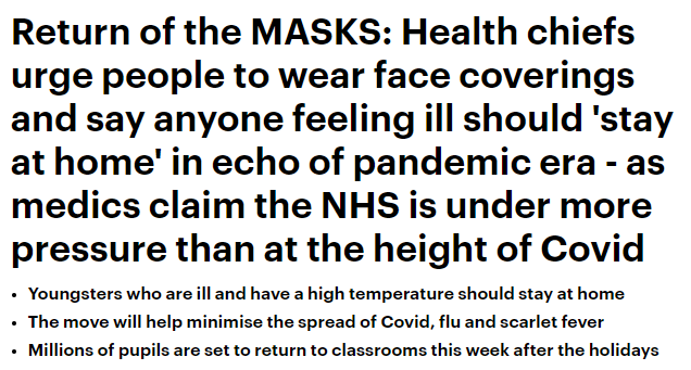 英国卫生安全局表示, 目前英国的新冠和流感都在高水平传播中 ,并再次强调了吸收和戴口罩的必要性,被英国媒体称之为“口罩回归”。