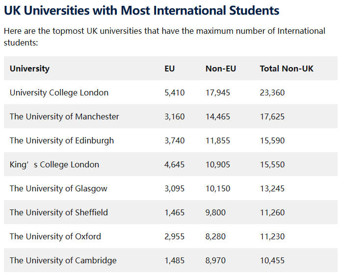 根据“Study in UK”的数据统计, UCL是英国拥有国际生人数最多的大学 ,无论是欧盟还是非欧盟的国际生人数,都是英国第一;