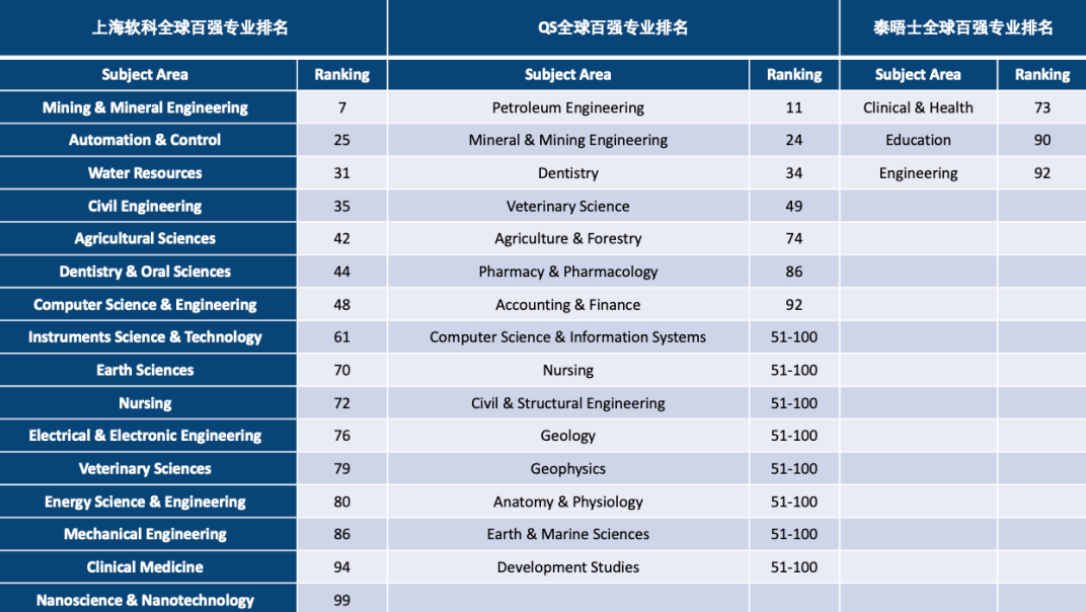 无论是泰晤士高等教育排名还是上海交通大学全球大学排名,阿德莱德大学都位列全球前1%。对于专业领域的全球排名,阿德莱德大学更是拥有令人骄傲的成就,有三个专业位列泰晤士报全球大学百强专业,十五个专业位列QS全球百强专业,十六个专业位列上海交通大学全球大学百强专业。全球学子热衷的 工程,教育,医学,农业等领域 都是阿德莱德的顶尖强势专业。