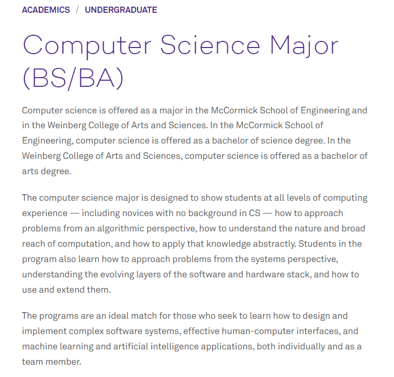 (我尽力翻译) McCormick工程学院和Weinberg文理学院开设了计算机科学专业。在McCormick工程学院,计算机科学是理科学士学位(BS)。在Weinberg艺术与科学学院,计算机科学作为文科学士学位(BA)提供。 计算机科学专业旨在向所有水平的学生--包括没有CS背景的新手--展示如何从算法的角度处理问题,如何理解计算的本质和广度,以及如何抽象地应用这些知识。 该项目的学生还将学习如何从系统的角度处理问题,了解软件和硬件堆栈的演变层,以及如何使用和扩展它们。 对于那些寻求学习如何设计和实现复杂的软件系统、有效的人机界面以及机器学习和人工智能应用程序的人来说,这些课程是理想的匹配,无论是个人还是作为团队成员。