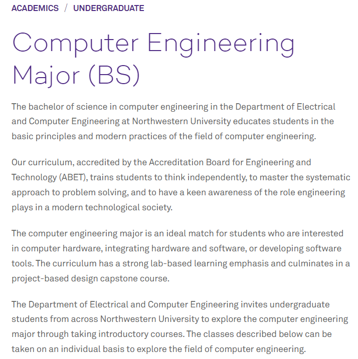 西北大学电气与计算机工程系计算机工程理学学士(BS),向学生传授计算机工程领域的基本原理和现代实践。 我们的课程由工程与技术认证委员会(ABET)认可,培养学生独立思考,掌握解决问题的系统方法,并敏锐地意识到工程在现代技术社会中所起的作用。 计算机工程专业是对计算机硬件、软硬件集成或开发软件工具感兴趣的学生的理想选择。课程强调以实验为基础的学习,并在基于项目的设计Capstone课程中达到学习目的。