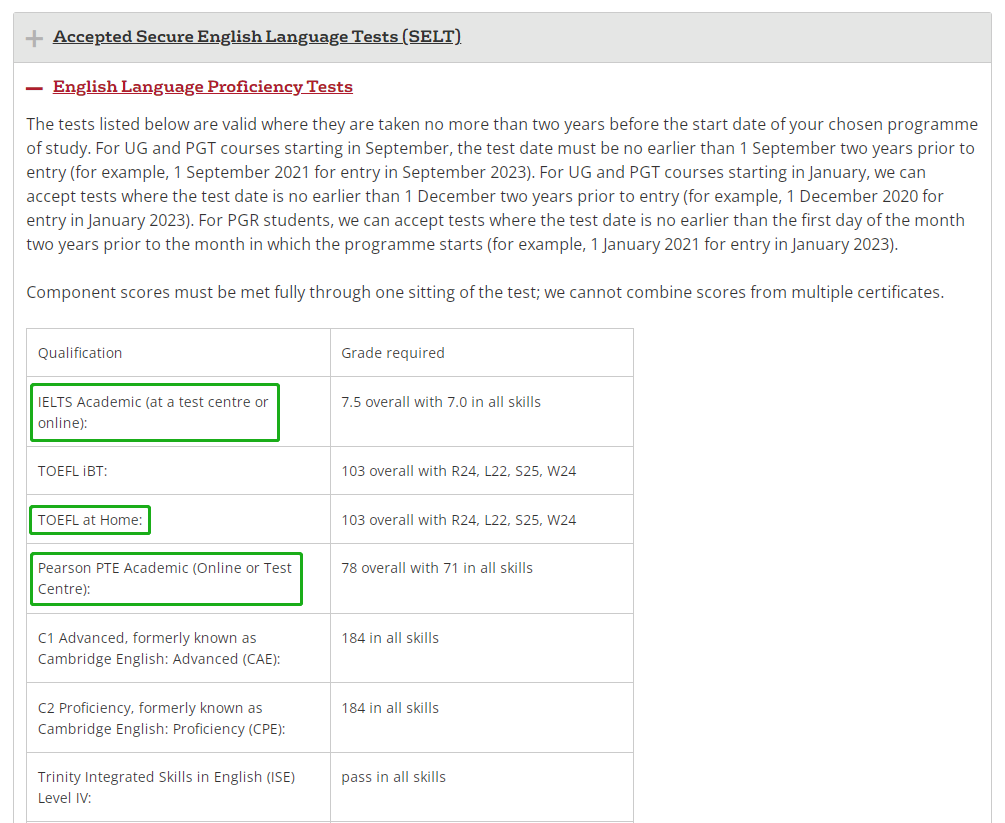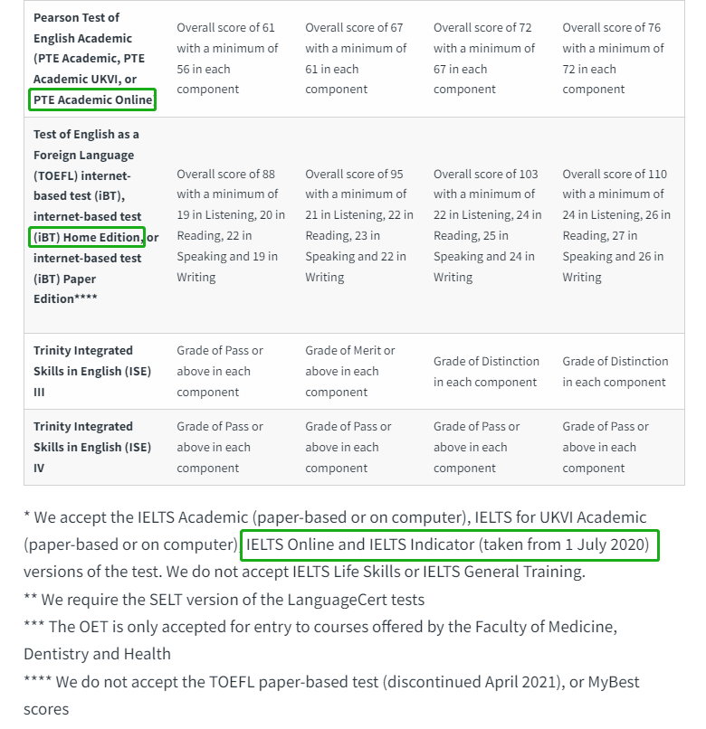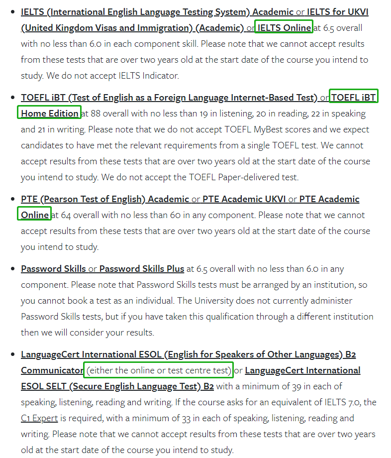 近期有不少学生卡在语言以至于换不了uncon,线下雅思考位还总是抢不到。其实除了线下考试, IELTS、TOEFL和PTE也提供线上考试 ,一起来看看这些英国热门大学23fall ( 硕士直入 ) 可以接受哪些线上语言考试类型吧~