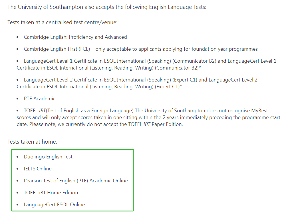 University of Southampton 南安普顿大学2023年硕士直入接受 多邻国 、IELTS Online、PTE Online、托福在家考,LanguageCert ESOL Online 考试