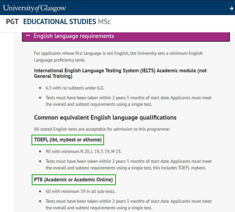 University of Glasgow格拉斯哥大学2023年硕士直入接受 PTE Online 和托福在家考
