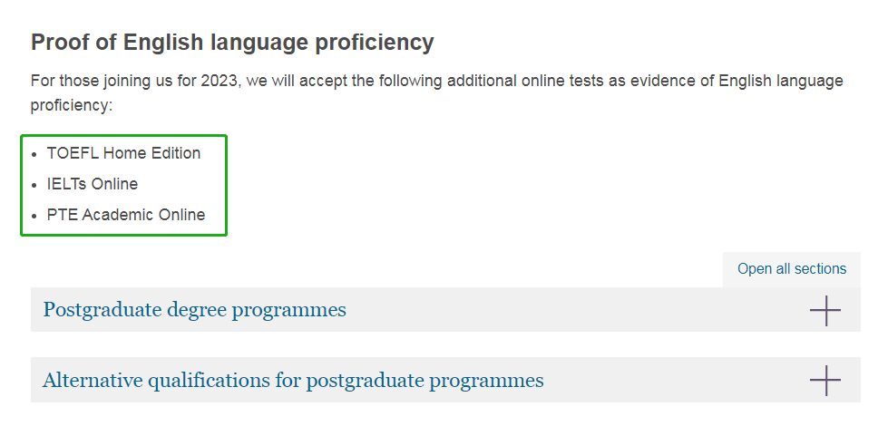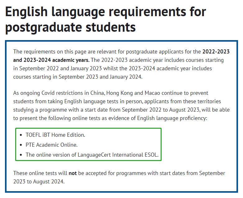 University of St Andrews圣安德鲁斯大学接受 托福在家考、PTE Online和LanguageCert International ESOL Online ,但仅适用于 2022年9月至2023年8月开学 的课程,2023年9月—2024年8月的课程将不再接受线上考试。