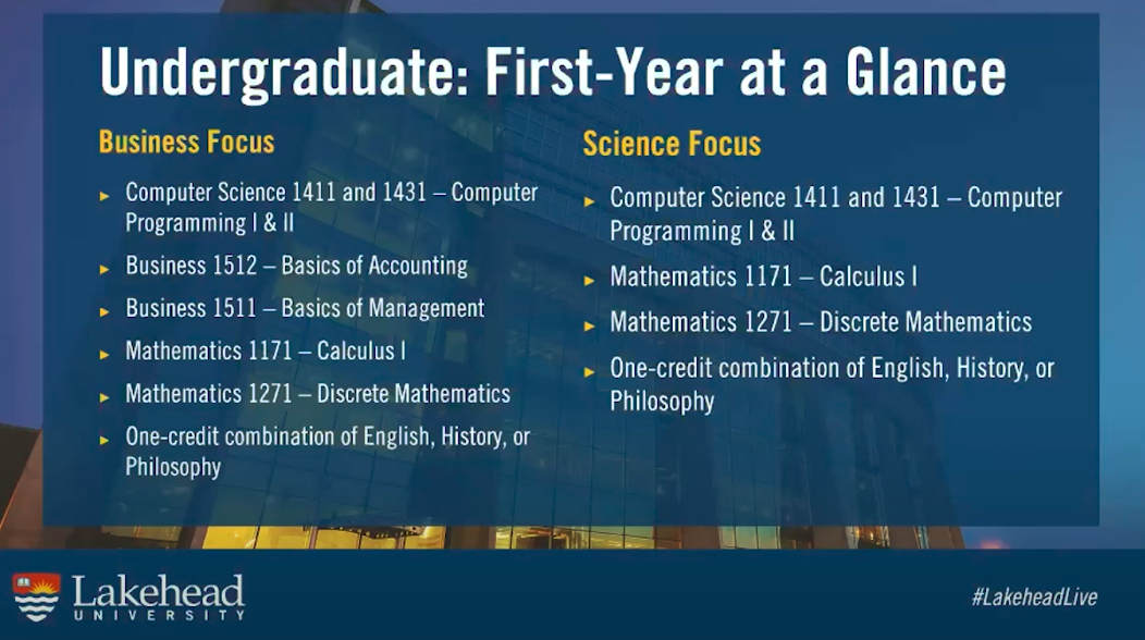 湖首大学计算机科学本科生需要在注册时选择他们想要辅修“商科 Business Focus”或是“理科 Science Focus”,并在第一年学习相应的基础课程。从大二学年开始,学生将开始学习计算机科学专业的必修课。