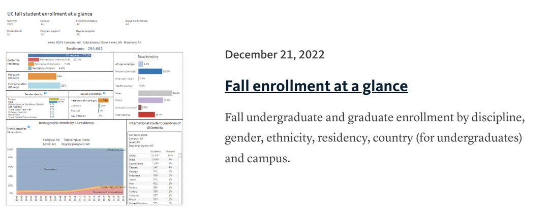 最近,加州大学公布了 2022年秋季学生入学数据 ,“缩招”是否属实?各校区的中国学生录取情况如何?在这份报告中都能找答案。