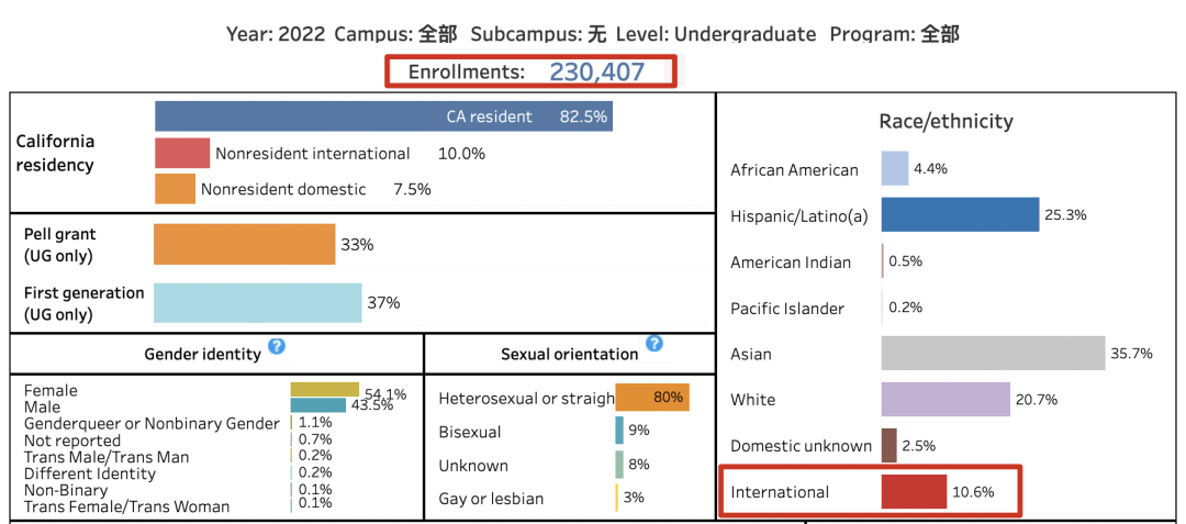 总体来看,去年秋天加州大学共有230,407名本科生入学。国际生占比10.6%, 其中中国学生14,492人,占比63%。