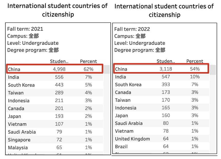 虽然中国学生依旧占国际生的半数以上,但和2021 Fall数据相比,直接锐减1880人,降幅高达37.6%! 这也是2018 Fall以来,中国学生入学人数的四连跌。