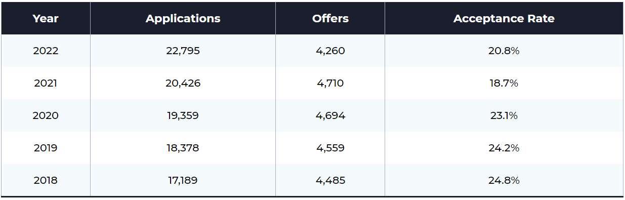 一般来说,剑桥大学的录取率约为 20-21% 。虽然看起来比美国顶尖大学的录取率高得多,但需要注意,剑桥大学的申请门槛更高,包括一名学生只能牛剑二选一,以及一年只能申请5所英国大学的限制。