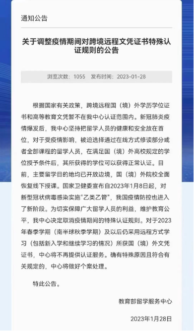 “为切实保障广大留学人员的利益,维护教育公平,我中心决定取消疫情期间的特殊认证规则。对于2023年春季学期(南半球秋季学期)及以后仍采用 远程方式学习 (包括新入学和继续学习的情况) 所获国(境)外文/凭/证书,中心将 不再提供认证服务 。确有特殊原因且符合有关规定的,中心将做好个案处理。”