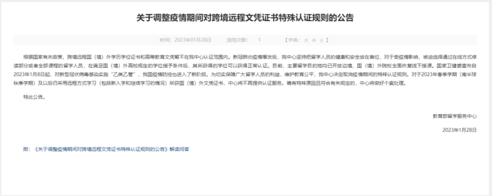 1月28日教育部发布了一个《关于调整疫情期间对跨境远程文凭证书特殊认证规则的公告》,一瞬间大批的留学生赶紧订机票,订住宿,准备飞往学校。 这个公告的核心思想就是:对于2023年春季学期(南半球秋季学期)及以后仍采用远程方式学习(包括新入学和继续学习的情况)所获国(境)外文凭证书,中心将不再提供认证服务。 ****