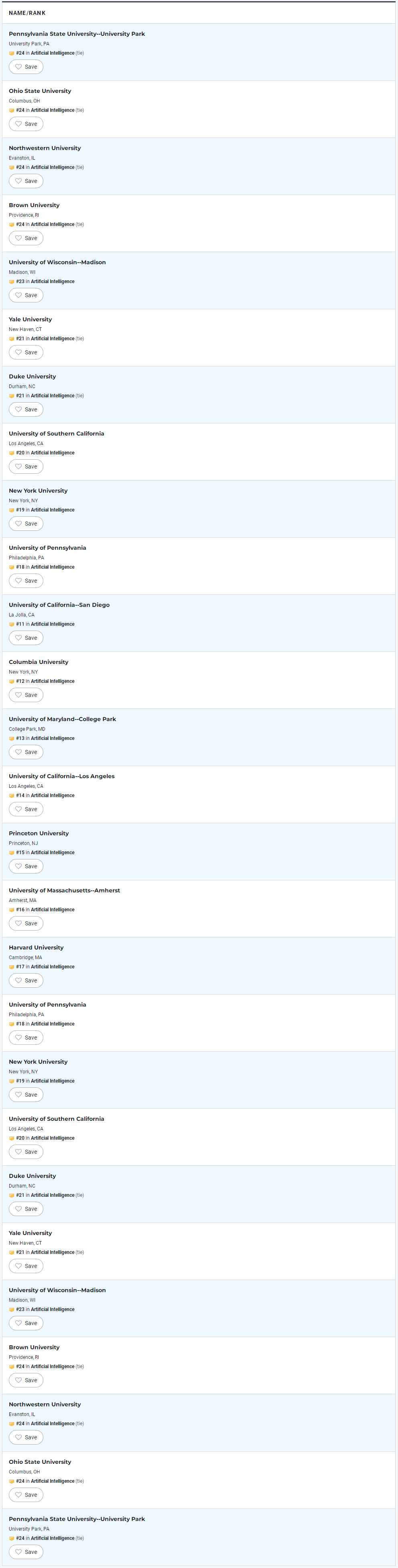 因为本科阶段的人工智能专业创立的时间并不长,且在本科A阶段就开始专业的美国大学也不是很多,所以上榜U.S.News的大学并不多,但均在AI或者CS领域拥有极高建树。