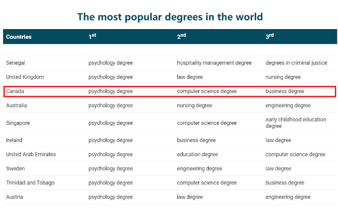 研究发现, 加拿大最热门的学位 是 心理学 (Psychology)、 计算机科学 (Computer Science)和 商科 (Business)。