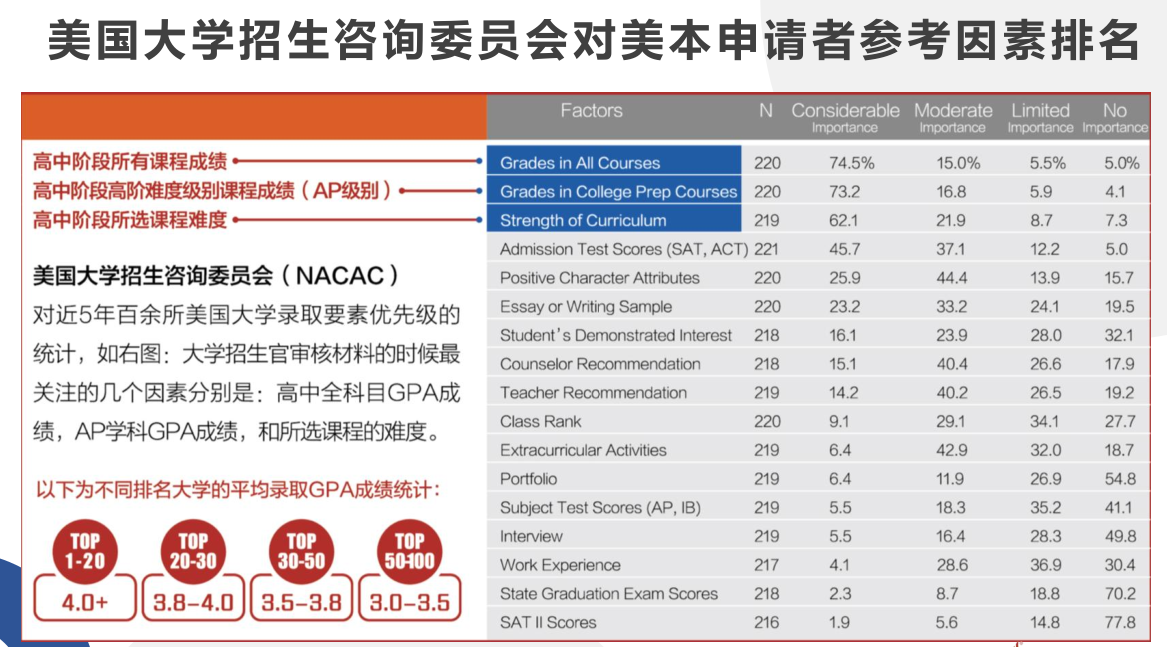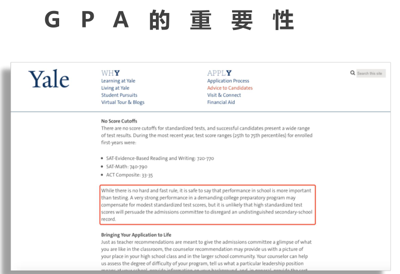 高中阶段的GPA是美国本科申请中最重要的材料,没有之一。耶鲁大学的官网上的一段文字做了最好的解释:标准化成绩不能弥补GPA成绩,GPA成绩可以弥补标准化成绩。