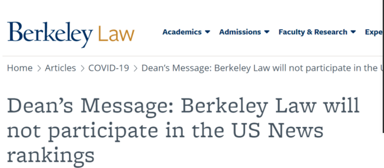继耶鲁和哈佛之后,加州大学伯克利分校法学院(Berkeley Law)也宣布退出US News & World Report法学院排名。
