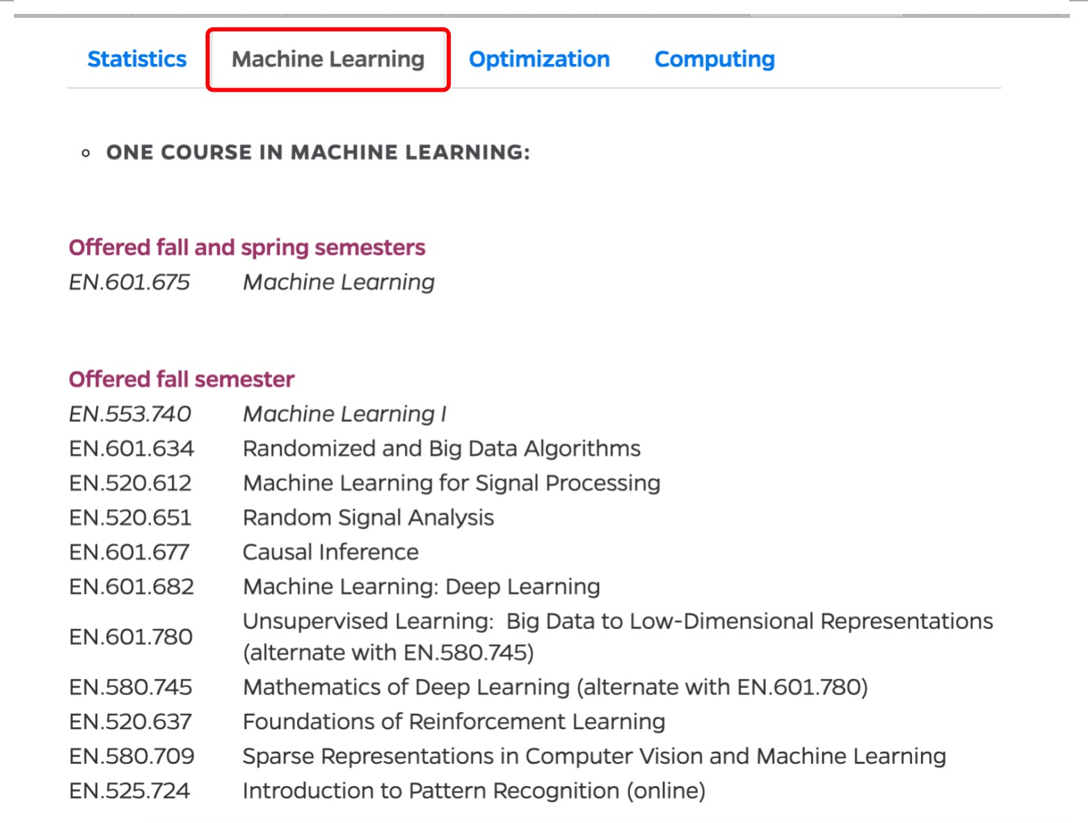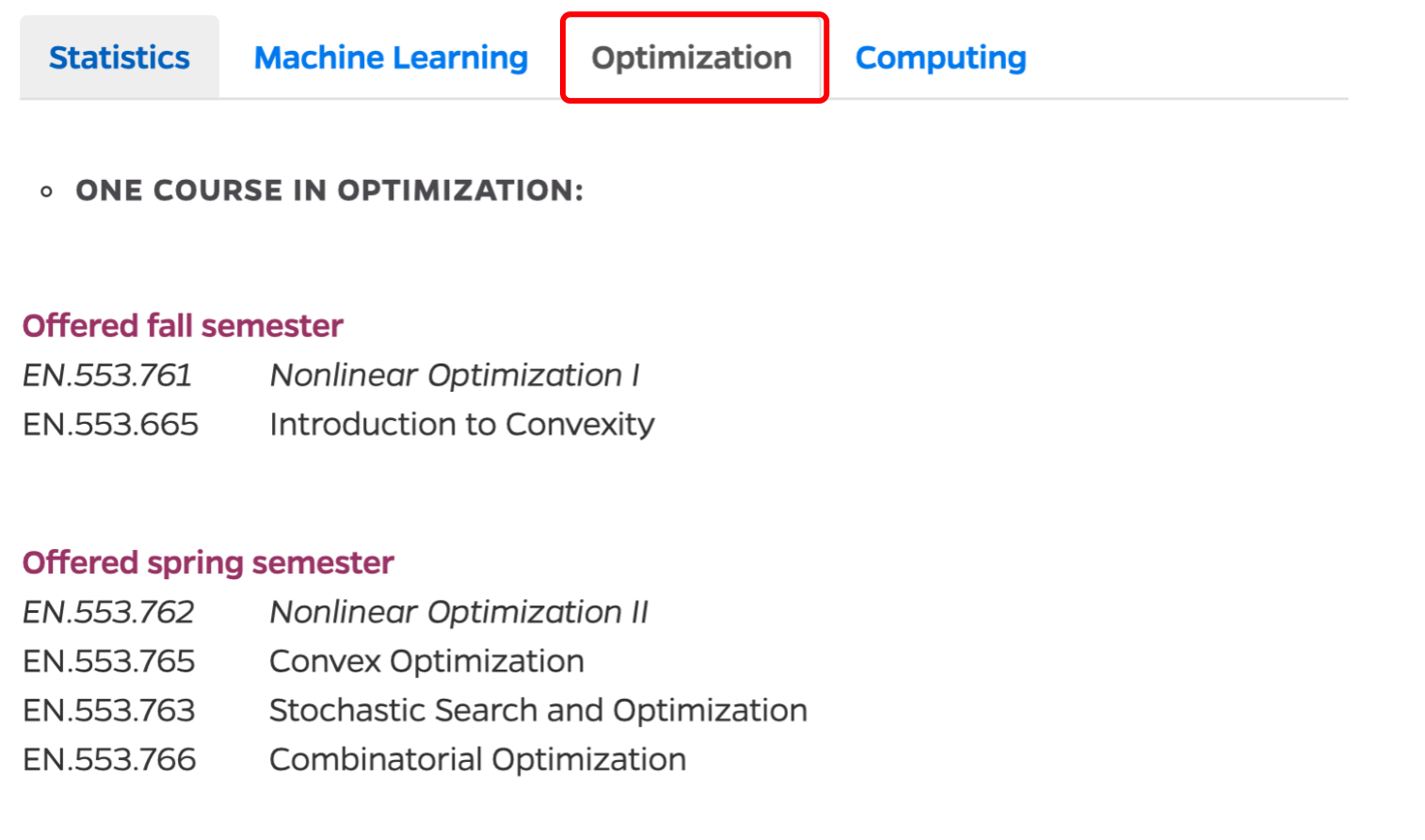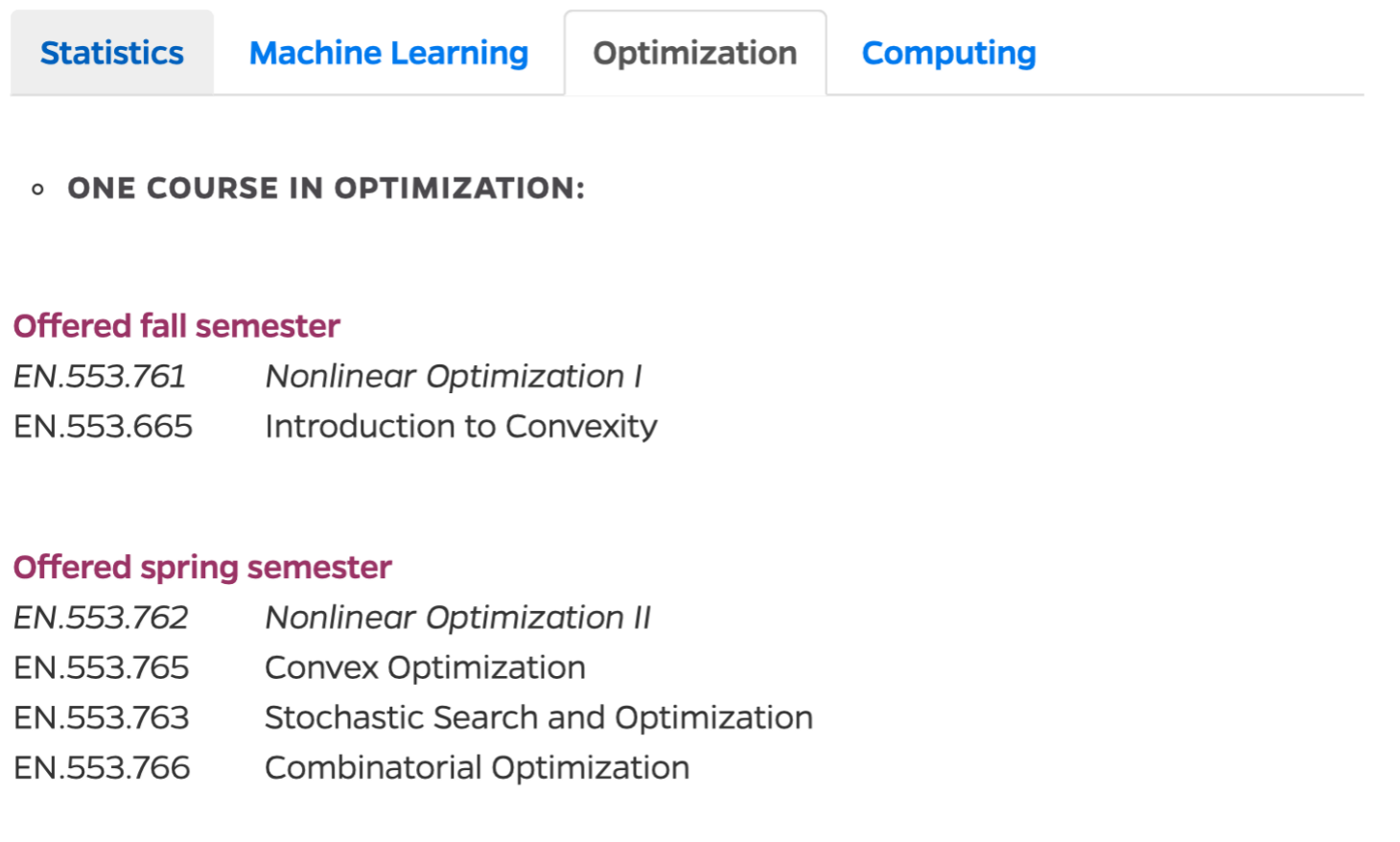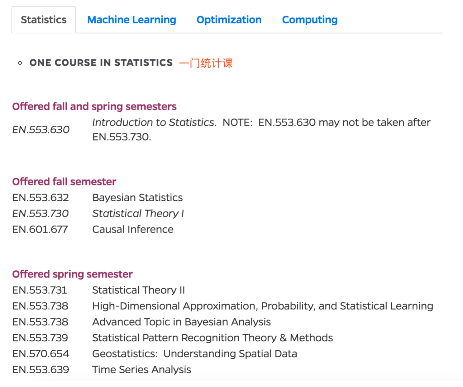 此项目课程覆盖4个模块课程:统计、机器学习、优化、计算,具体课程如: