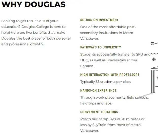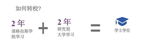BC省拥有完善的大学转学分体系,学生可以在道格拉斯学院学习两年,把学分转到加拿大其他研究型大学如UBC、SFU、UVIC等去获取这些名校的学士学位。