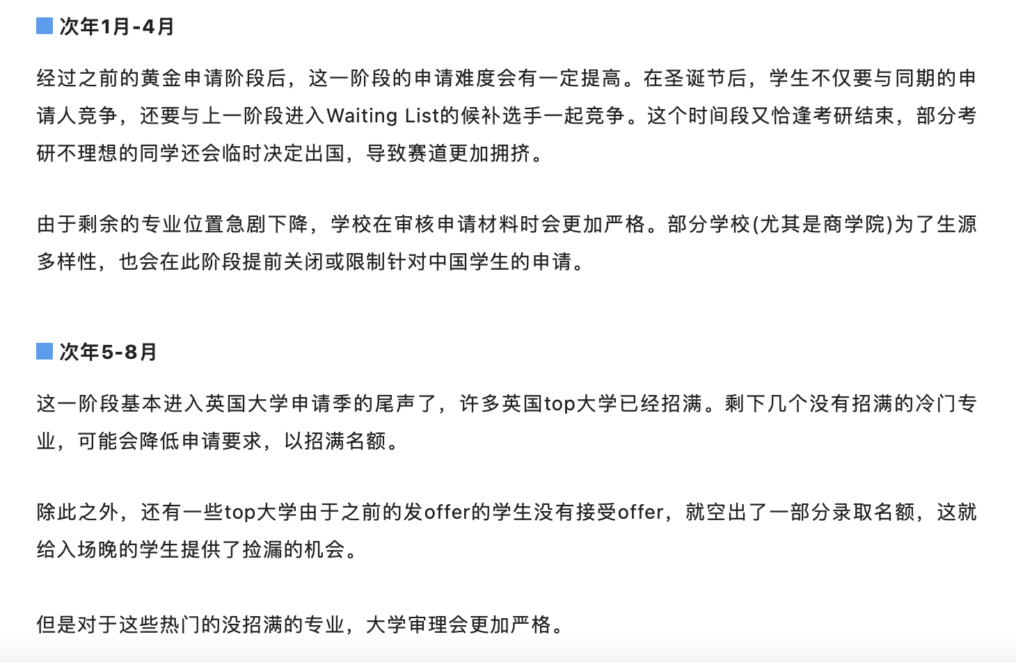 这个阶段的申请优势是,大部分英国大学刚刚处理完新生入学工作,空余时间比较多,学校的申请名额也最充足,录取的几率最大,门槛最低,因此同学们都选择在此时递交申请。 这个时间段,学生的申请邮件比较多,学校处理申请相比较会慢一些。