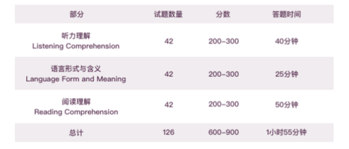 小托福的考试形式是纸+笔考试,共分为三大部分:听力、语言形式及含义、阅读理解。每部分包含42道选择题,共126道题目。考试时长为110分钟,考试分数为600-900分。