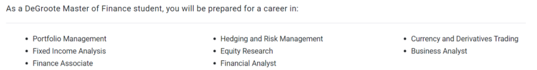 往期毕业生从事的职位有:项目组合管理、固定收益分析、财务助理、套期保值和风险管理、股票研究、金融分析师、货币及衍生品交易、业务分析师。