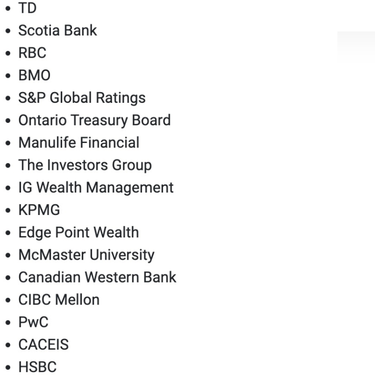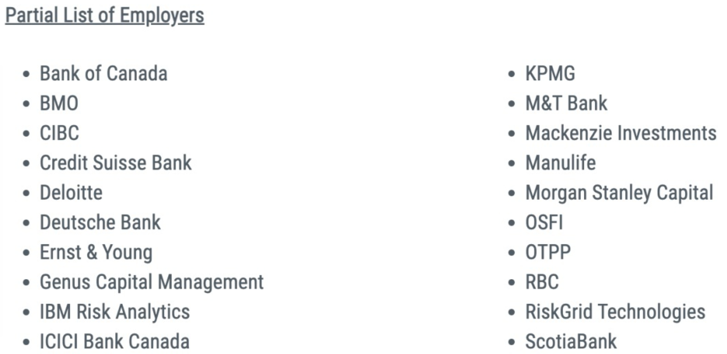 90%的学生在毕业一年内进入金融行业。M-Phimac的毕业生拥有很高的就业成功率,大多数毕业生在完成课程后紧接着开始工作。大约四分之三的毕业生在加拿大五大银行工作;其余的人则在相关公司任职,如财务咨询公司、保险公司、养老金计划、财务软件公司和金融监管机构。