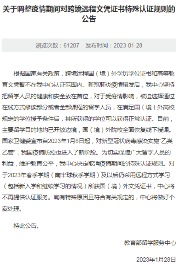 2023年1月28日,教育部留学服务中心发布公告,宣布根据国家有关政策,跨境远程国(境)外学历学位证书和高等教育文凭暂不在教育部留学服务中心认证范围内。
